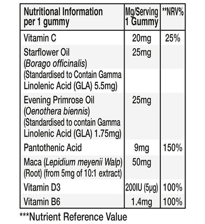 Sweeteners (Maltitol Syrup, Sorbitol, Erythritol, Isomalt, Steviol Glycosides), Gelling Agent (Citrus Pectin), Acid (Citric Acid), Ascorbic Acid, Starflower Oil , Evening Primrose Oil, Calcium D-Pantothenate, Natural Flavouring, Acidity Regulator (Sodium Citrate), Glazing Agents (Medium Chain Triglycerides, Coconut Oil, Rapeseed Oil, Carnauba Wax), Maca Extract, Cholecalciferol, Pyridoxine Hydrochloride, Natural Colourants (Anthocyanins, Carotene).