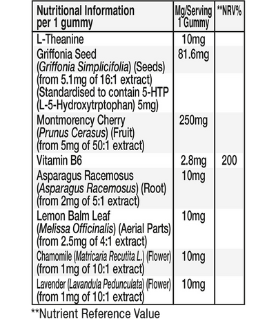 Sweeteners (Maltitol Syrup, Xylitol, Isomalt, Erythritol), Gelling Agent (Pectin), Acid (Citric Acid), Natural Colours(Spirulina Concentrate, Anthocyanins, Carotenes), Natural Flavouring, Glaze (Coconut Oil, Rapeseed Oil, Glazing Agent Carnauba Wax), L-Theanine, Acidity Regulator (Sodium Citrate), Griffonia Seed Extract, Montmorency Cherry Extract, Pyridoxine Hydrochloride, Asparagus Racemosus Extract, Lemon Balm Extract, Sweetener (Steviol Glycosides from Stevia), Chamomile Extract, Lavender Extract.